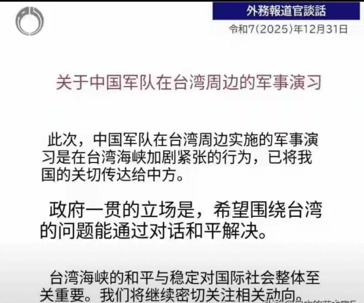 日本 高市没有选择在第一时间公开表态,而是沉默三日后,由外务省发言人北村俊博以个人名义发布声明。同时有意安排在英、德、法与欧盟表态之后,以旁观者姿态试图减弱此事热度。声明内容看似措辞谨慎,实则充满暗流。无激烈词语,却步步紧逼:首先对军演“表达关切”,指演习加剧两岸紧张;其次呼吁应通过和平对话解决分歧;最后宣称日本将“全程高度关注”。